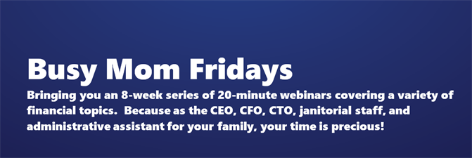 The Busy Mom webinar series is an 8-week series of 20-minute webinars to share information to help you busy moms in your financial planning. These are short 20-minute webinars that hopefully fit into your busy day!